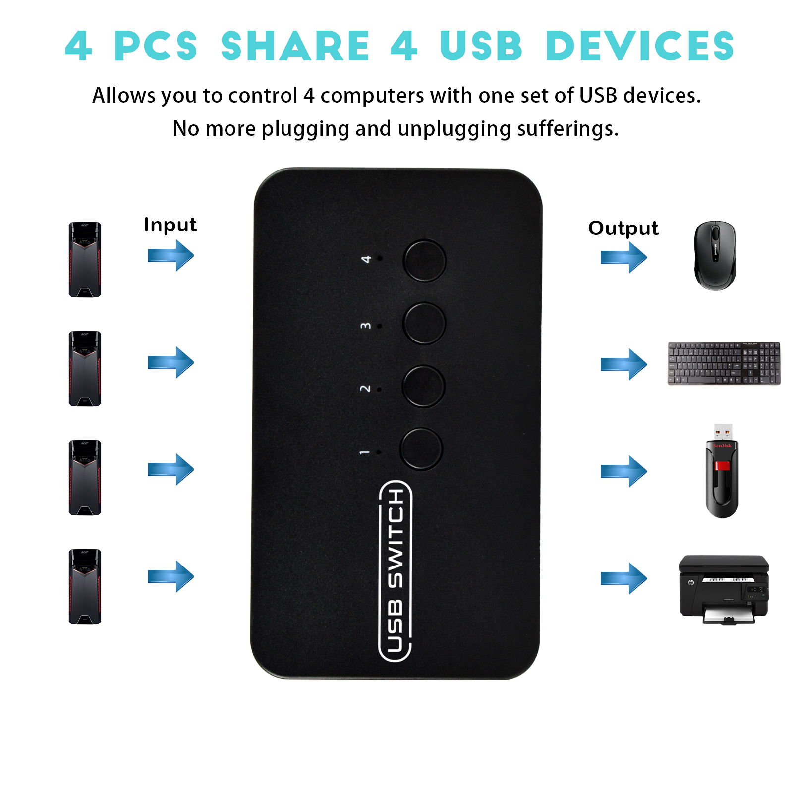 4 Port USB Switch Box - The 4 in 4 out USB Switcher allows you to share 4 USB2.0 peripheral devices (keyboard, mouse, scanner, printer, flash drive and USB stick) between 4 computers. Without constantly swapping cables or set up complicated network sharing software.